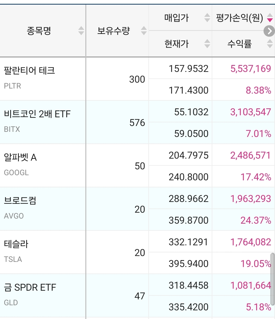 박 대리는 오랜만에 잔고를 확인하다가 심장이 쿵쾅 뛸 만한 수익률을 발견했다. 팔란티어 테크놀로지스(PLTR) — 무려 300주, 550만 원이 넘는 평가차익! 하지만 이 성과는 결코 단번에 이루어진 게 아니었다. 오랬동안 매수했던 팔란티어가 190달러에 달하자 수천만원의 차익실현 후 다시 한번 기회를 잡게 된 것이었다.