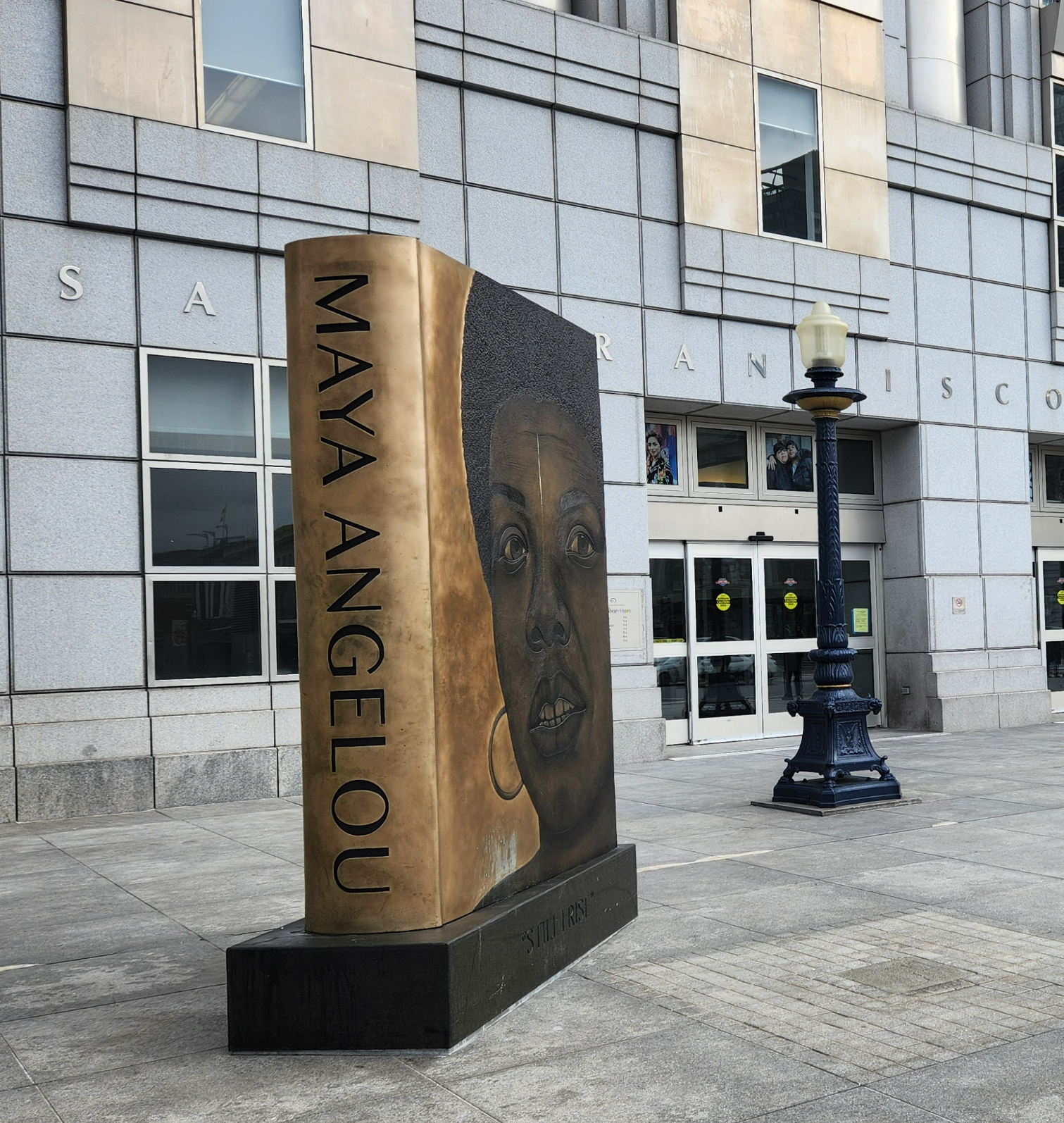 샌프란시스코 시청 멋진 건축을 감상했다면 넓은 잔디밭 광장을 가로질러 거대한 회색 건물을 마주하게 됩니다. 바로 샌프란시스코 공립 도서관 ‘SAN FRANCISCO PUBLIC LIBRARY’—미국 서부의 지성이 자리잡은 장소입니다. 그런데 평범한 대리석 외벽과 네모반듯한 창문 사이로, 정말 눈길을 확 사로잡는 한 조형물이 떡 하니 자리 잡고 있는데요. 가까이 다가가보니, ‘MAYA ANGELOU’라는 커다란 글씨와 함께 마야 안젤루의 얼굴이 새겨진 조각상이 눈에 들어왔습니다.