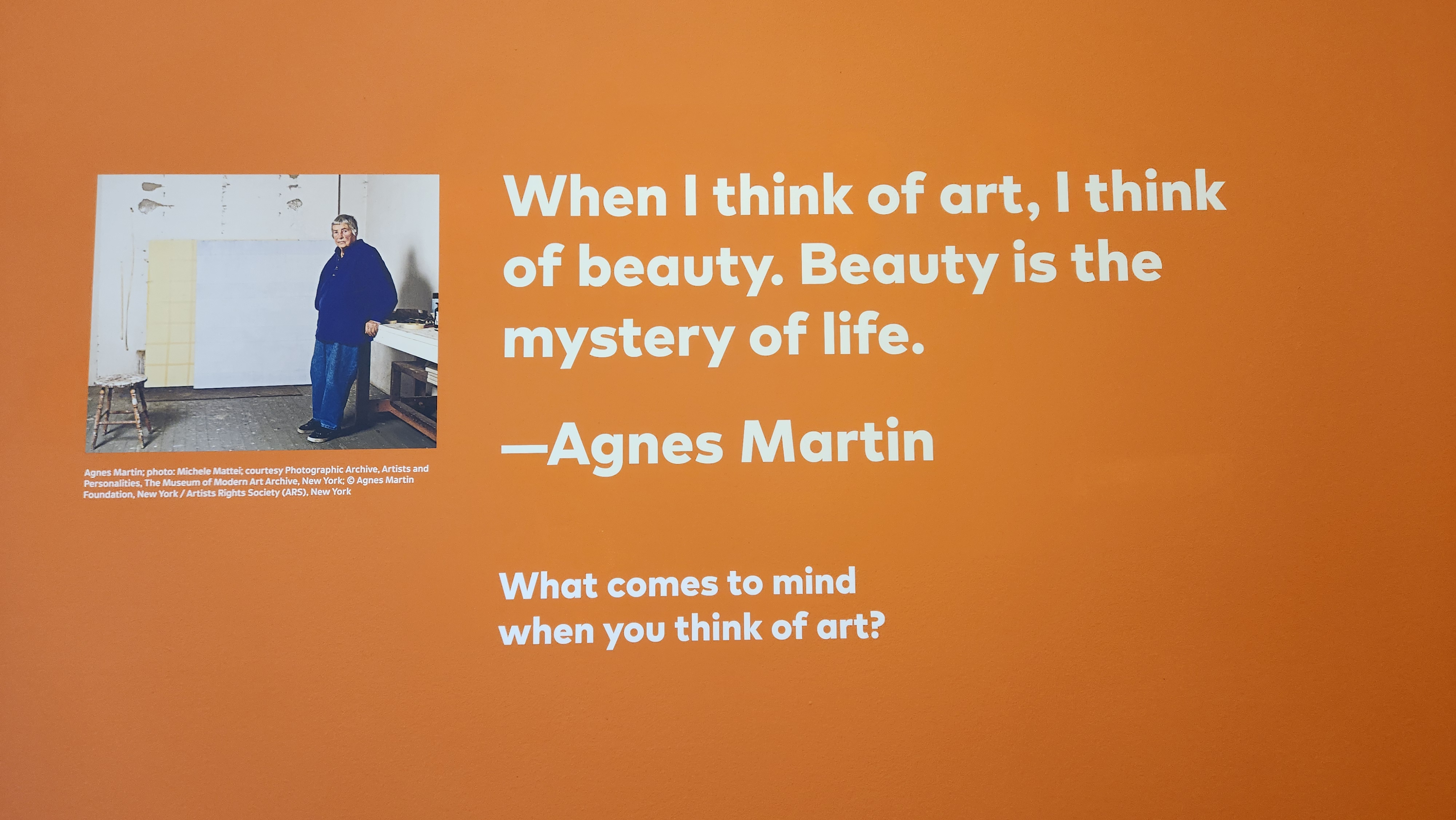 애그니스 마틴의 글귀 아래 덧붙여진 질문, “예술을 생각할 때 어떤 생각이 드나요?”