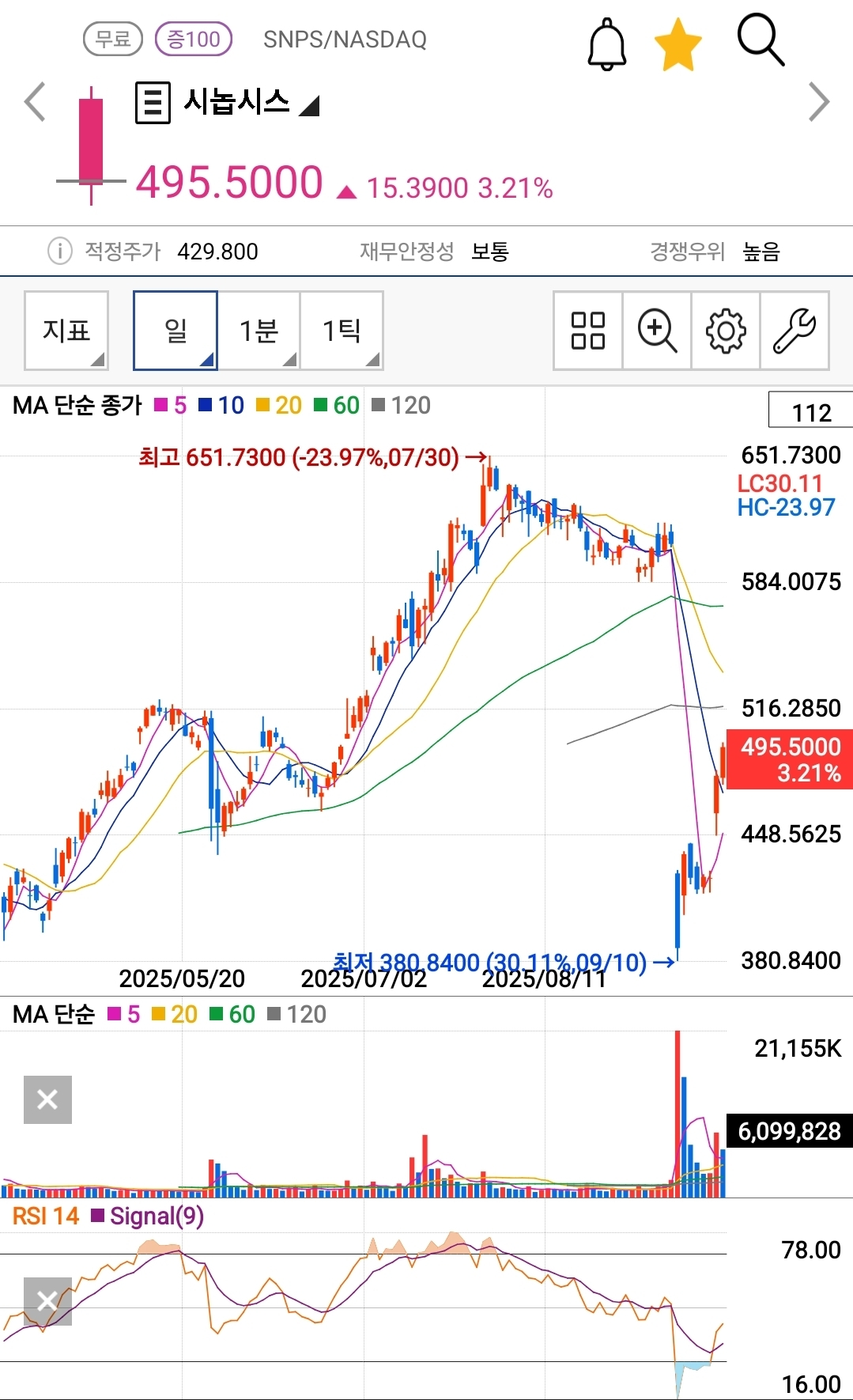 시놉시스가 실적 쇼크로 단 하루 만에 30% 넘게 추락한 폭락 이틀 후, 시놉시스는 예상 밖의 강한 반등 흐름을 보였다. 주가는 495.50달러까지 치솟고, 박 대리의 수익은 단숨에 +1,239,592원(9.33%)으로 튀어오른다.