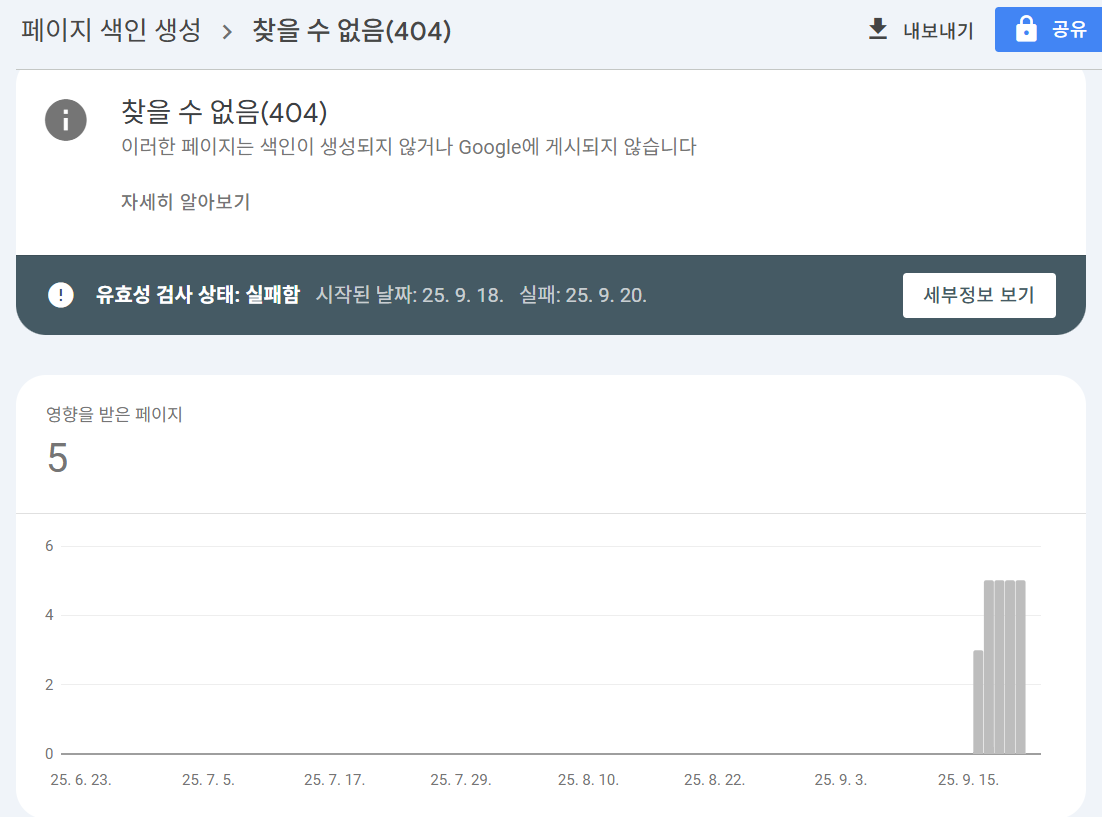 - 구글 서치콘솔 '커버리지' 보고서에서 404 오류가 발생한 URL 목록을 확인합니다.