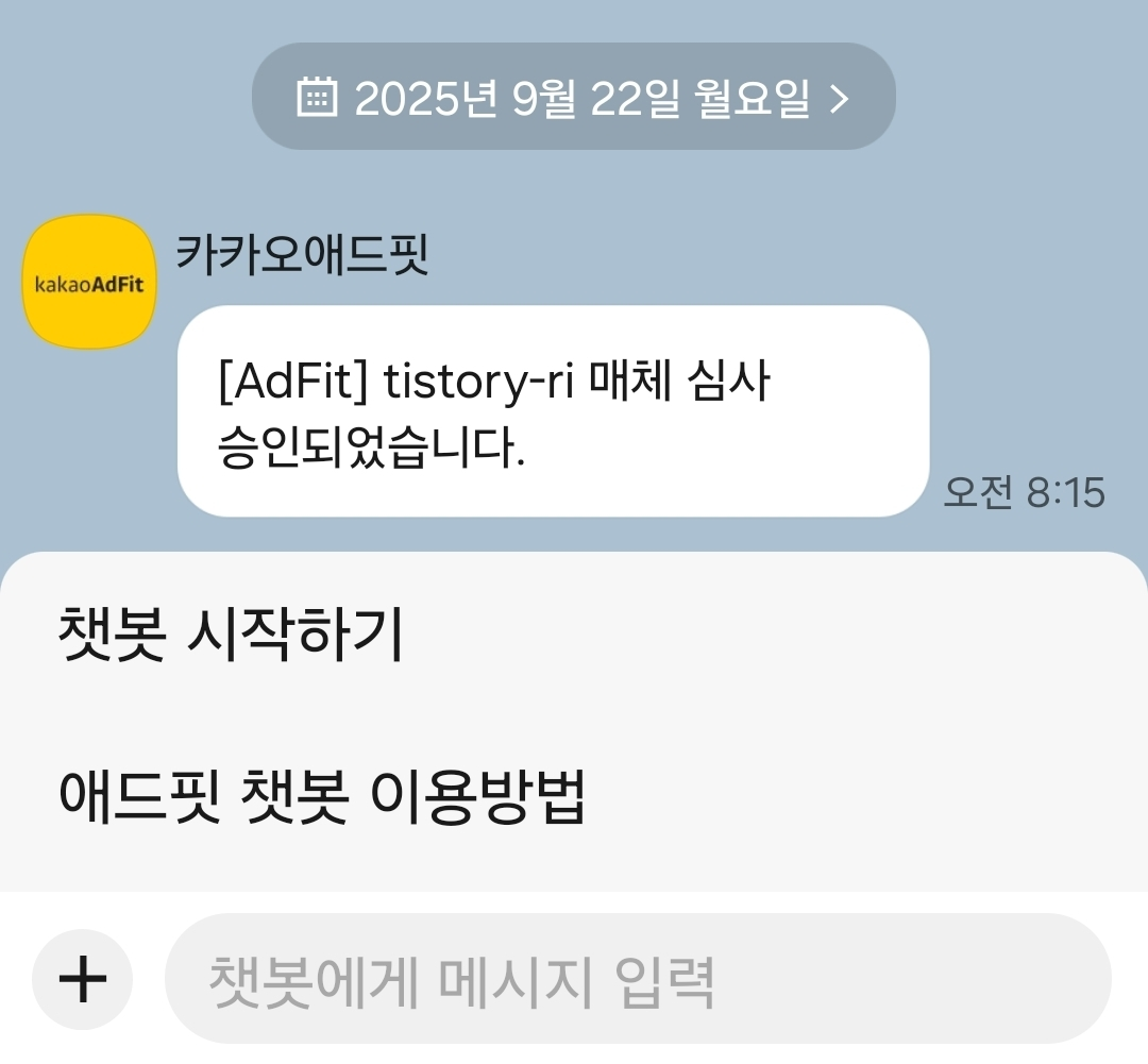 이 모든 과정을 마친 뒤에는 애드핏 관리자에서 재심사 버튼을 눌러 심사를 다시 요청했습니다. 이전엔 보류만 뜨더니, 광고가 정상적으로 달리자 바로 승인이 났습니다. 아침에 카카오톡 애드핏 메시지로 “[AdFit] tistory-ri 매체 심사 승인되었습니다.”라는 축하 알림을 받았을 때 정말 뿌듯했어요!