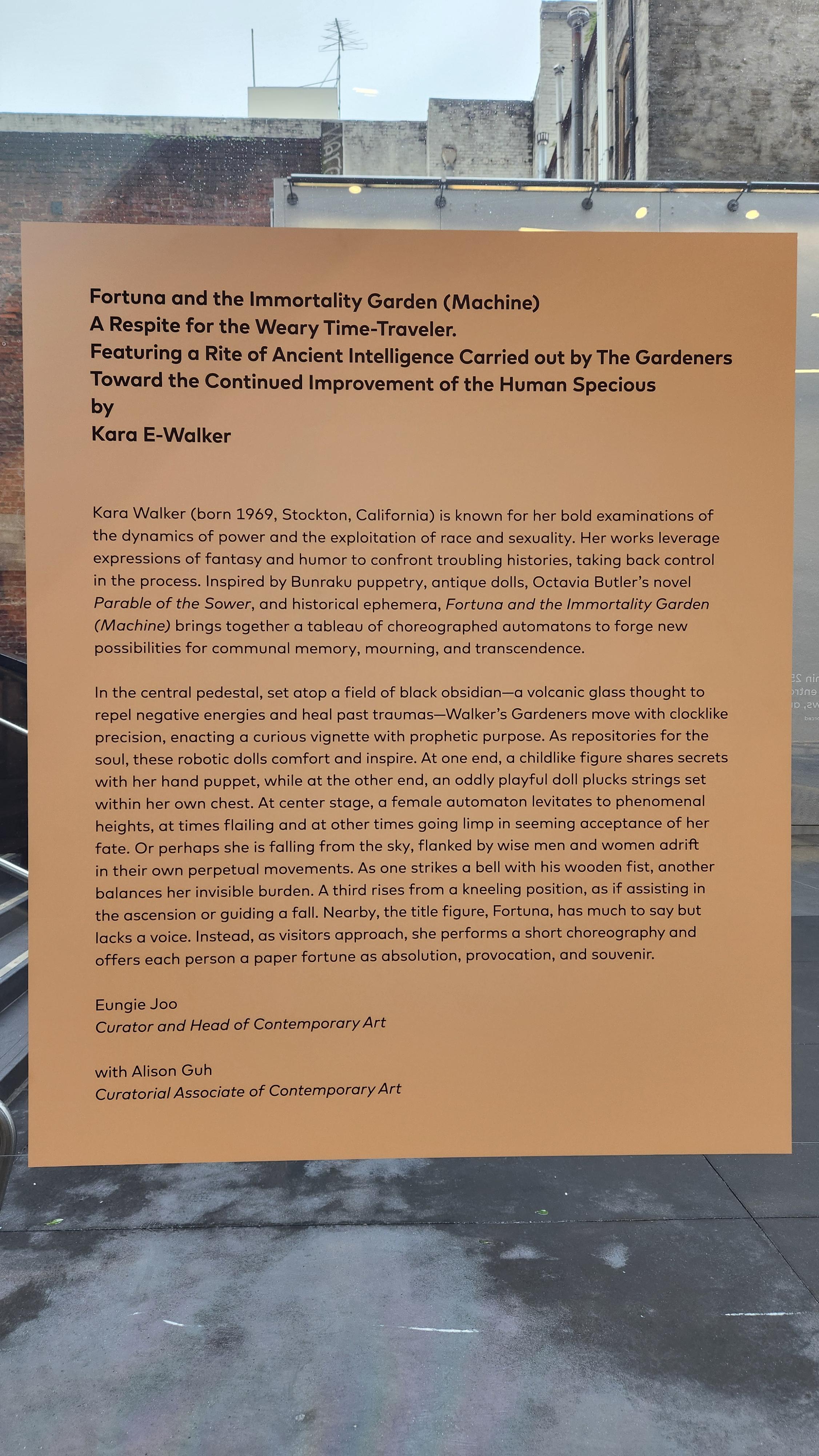 카라 워커(1969년 생, 캘리포니아 스톡턴 출신)는 권력의 역동성 및 인종과 성의 착취를 대담하게 탐구하는 작품으로 잘 알려져 있다. 그녀의 작품은 판타지와 유머를 적절히 활용하여 어려운 역사를 마주하고, 그것을 예술로 되찾아오는 과정을 보여준다. 번라쿠 인형극, 골동품 인형, Octavia Butler의 소설 「곡식 파종자의 우화」, 그리고 역사적 유물 등에서 영감을 받아, 「포르투나와 불멸의 정원(기계)」은 공동의 기억과 애도, 초월의 가능성을 탐구하는 자동인형들의 장면을 함께 보여준다.