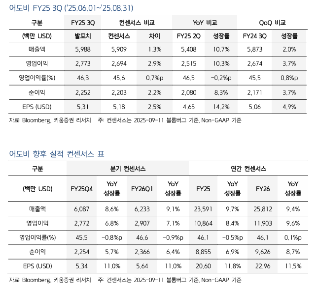 2025년 9월 기준 어도비의 주요 지표는 매우 인상적입니다. 3분기 매출은 약 59.9억 달러로 전년 대비 11% 성장했고, 영업이익률 역시 46% 내외로 소프트웨어 업계에서 손꼽히는 효율성을 보여줍니다. EPS(주당순이익)는 5.31달러로 14%나 늘었습니다.