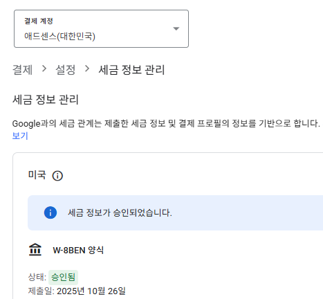 이렇게 실제로 세금 정보를 올바르게 제출해 승인받으면, 미국 세금 원천징수에 대한 부담 없이 광고 수익을 온전히 받을 수 있습니다.