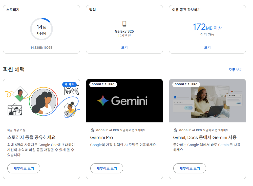 - 결제 후 구글 원(Google One) 앱을 활용해 백업 관리, 스토리지 최적화, 추가 혜택(Google 전문가 상담, 호텔 특가 등)도 함께 누릴 수 있습니다.
