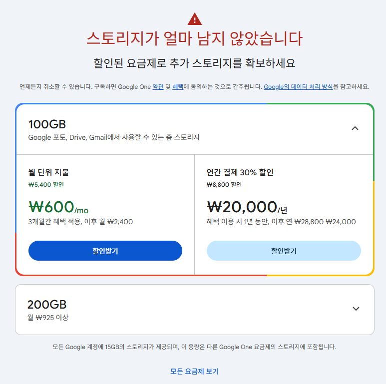- 장기적으로 구글 서비스(포토, 드라이브, Gmail)를 많이 활용한다면: 연간 결제(20,000원)로 번거로움 없이 저렴하게 용량을 확보할 수 있습니다.