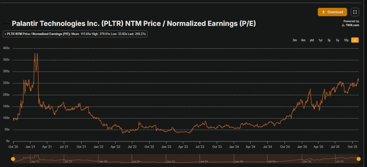 팔란티어는 2025년 3분기 실적에서 매출 11억8,000만 달러, 주당순이익(EPS)은 0.21달러를 기록하며, 시장 전망치(매출 10억9,000만 달러, EPS 0.17달러)를 모두 상회하는 ‘어닝 서프라이즈’를 달성했습니다. 하지만 연초 대비 170% 가까이 치솟은 주가와, 현재의 밸류에이션(주가수익비율)이 과도하다는 투자자들의 우려가 실적 발표와 동시에 터져 나왔고, 단기 급등에 따른 차익실현 매물과 심리적 부담이 더해졌습니다.
