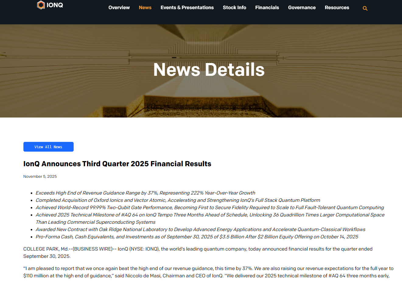 - CEO 코멘트: "최고 수준의 스케일, 강력한 현금 포지션, 정부 및 상업 시장 내 모멘텀으로, 오류정정 양자컴퓨팅 진입에 근접"이라는 평가.