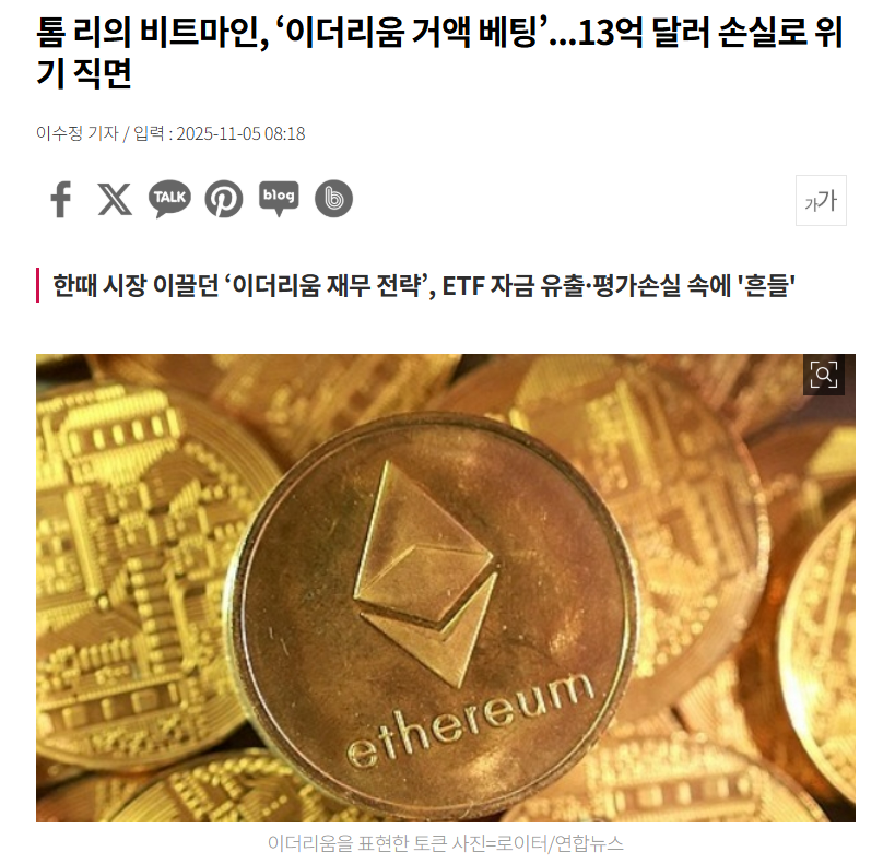 - 단기 리스크: 추가 매수 뉴스와 함께 단기간 주가와 ETH가 반등할 가능성이 있으나, 시장ㆍ규제 리스크, 펀더멘털 대비 프리미엄 지속 여부, 대규모 매집에 따른 주식 희석(공급 과잉) 등 부정적 요인도 병존합니다.