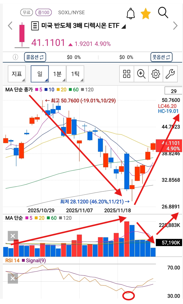- 10월 말 50.76달러 고점 이후 단기 하락 추세가 이어지다가, 11월 21일 28.12달러에서 급락이 멈추며 첫 ‘공포성 저점’이 만들어졌습니다.